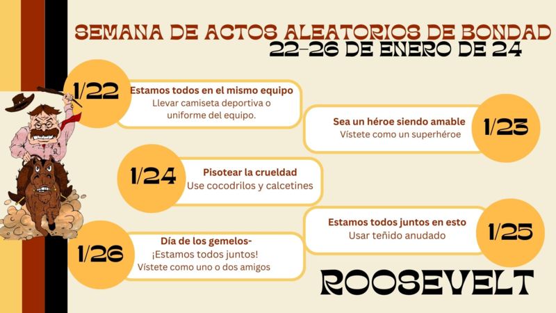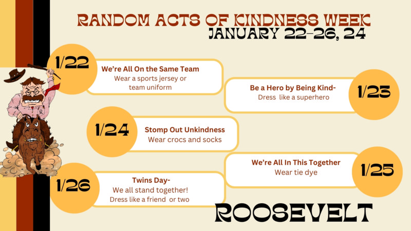 Random Acts of Kindness Week Tags: Roosevelt School Date Mon, Jan 22, 2024 Time All Day Organizer Stephanie McDaniel Random Acts of Kindness Week Dress Up Days - English Dress Up Days Spanish
